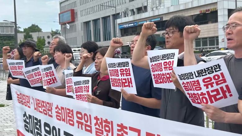 전국농민회총연맹은 오늘(24일) 서울 용산 대통령실 앞에서 기자회견을 열고 송미령 농림축산식품부 장관 유임 철회를 촉구했습니다.