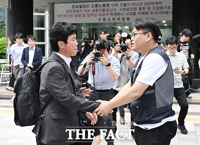 [더팩트ㅣ박헌우 기자] 김영훈 고용노동부 장관 후보자(왼쪽)가 24일 오후 서울 중구 서울지방고용노동청에 마련된 인사청문회 준비 사무실에 출근하며 서울지방고용노동청 앞에서 집회 중이던 민주노총 금속노조 주얼리분회 조합원과 인사하고 있다.