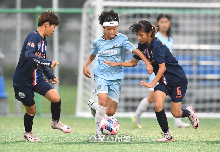 서울 우이초 오연서(왼쪽)와 위지수(오른쪽)가 24일 경남 합천에서 열린 ‘2025 스포츠케이션 명품도시 합천에서 펼쳐지는 제33회 여왕기 전국여자축구대회’ 초등부 충북 남산초와의 8강전에서 남산초 최아인의 공격을 막아내고 있다. 2025. 6. 24.