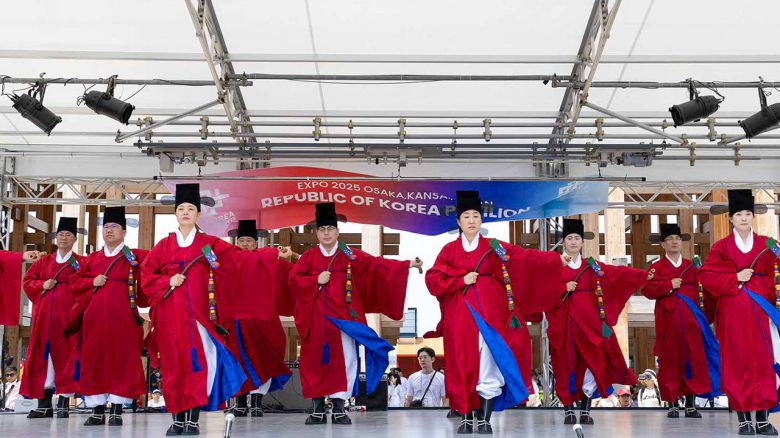 크라운해태 임직원들은 지난 22일과 그제(23일), 오사카엑스포에서 서울예대 학생들과 함께 4차례 종묘제례 일무와 경기민요, 사물놀이 등 우리 전통음악과 춤을 선보였습니다.