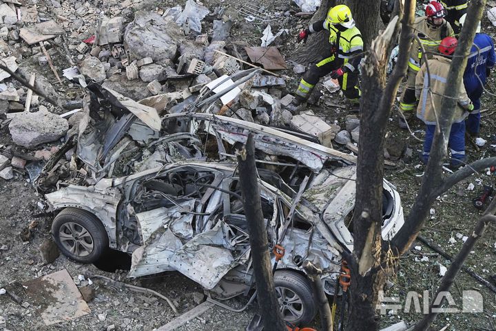 [키이우=AP/뉴시스] 24일(현지 시간) AP 통신에 따르면 러시아가 쏜 탄도미사일이 우크라이나 남동부 최대 도시 드니프로를 강타해 최소 15명이 숨졌다. 전날에는 수도 키이우의 아파트 건물이 공격받아 9명이 사망했다. 사진은 23일(현지 시간) 우크라이나 키이우에서 소방관들이 러시아의 공격으로 발생한 화재를 진화하는 현장에 파괴된 차량 잔해가 남아 있는 모습. 2025.06.25. |