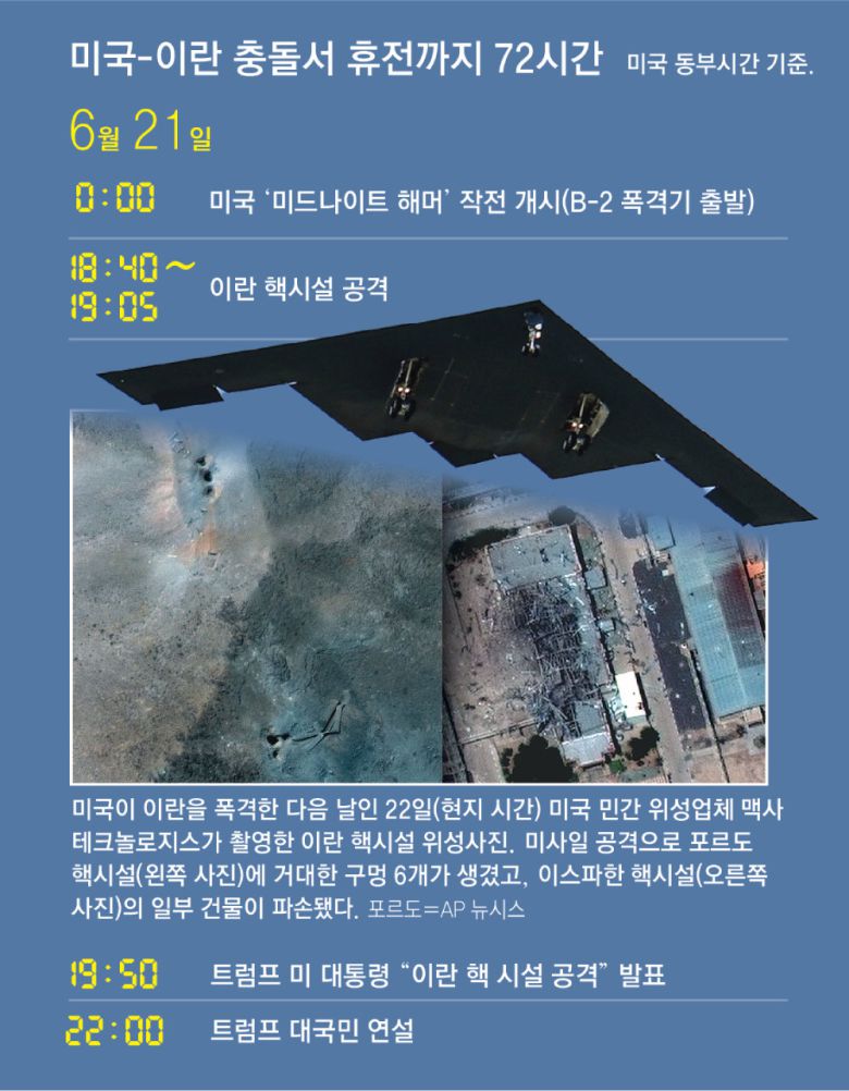 이날 아바스 아라그치 이란 외교장관은 보복 공격 뒤 “미국의 이란 공격은 시온주의자 정권(이스라엘)의 나약함과 절박함을 보여주는 것”이라면서도 “이란은 중동의 역내 긴장 고조를 원하지 않는다”고 밝혔다. 이어 트럼프 대통령이 제안한 이스라엘과의 휴전 제안을 24일 전격 수용했다. 트럼프 대통령은 미국 동부시간 기준 이날 오전 1시 휴전이 발효됐다고 선언했다. 21일 오전 12시 B-2 스텔스 폭격기가 미국 미주리주에서 출격하며 시작된 미국과 이란의 충돌이 72시간 만에 종료된 셈이다.