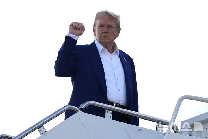 [앤드루스합동기지=AP/뉴시스]도널드 트럼프 미국 대통령이 24일(현지 시간) 메릴랜드주 앤드루스합동기지에서 대통령 전용기에 탑승하며 주먹을 들어보이고 있다. 2025.06.24. |