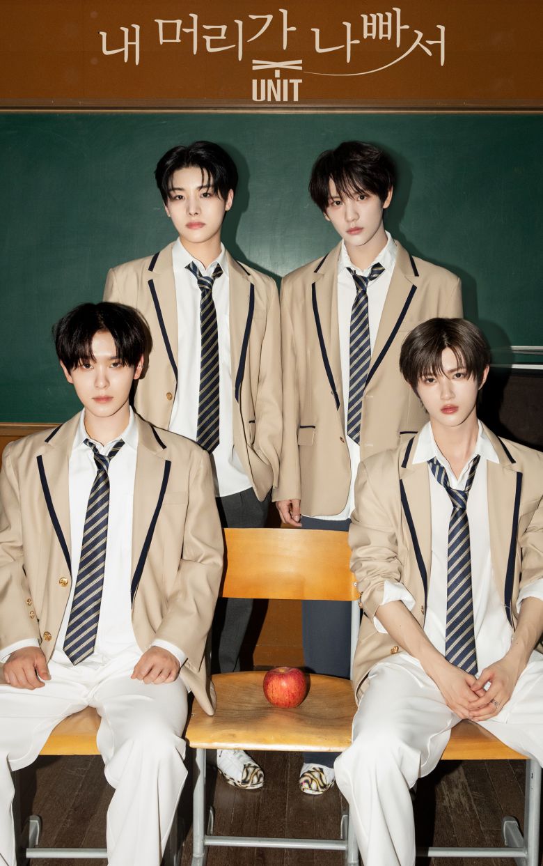 렉스(LEX) 현식(HYUNSIK) 씽(SING) 리오(LEO)가 참여한 타이틀곡 '내 머리가 나빠서' 티저에서도 일부 노래가 공개돼 X-UNIT만의 감성 서사를 예고했다. 한 소녀의 자화상이 일그러지는 것으로 첫 장면부터 미스터리하면서도 신비로운 분위기로 궁금증을 자극하며 팬들의 시선을 사로잡았다. 마치 미래를 예견하는 듯한 타로 카드들과 졸업 앨범들이 다양한 사건들을 암시하며 X-UNIT가 연기와 노래로 들려줄 콘셉트들에 대한 기대감으로 번지고 있다.