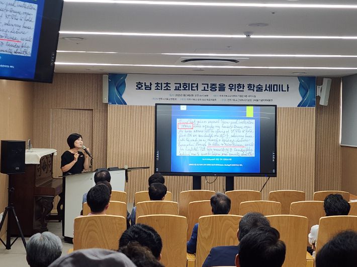 24일 전주기독교근대역사기념관에서 열린 <호남 최초 교회터 고증을 위한 학술세미나> 현장. 이 자리에서 김경미 교수는 은송리 교회의 위치가 현 완산칠봉 옆 명륜맨션 인근 부지라는 연구 내용을 발표했다.