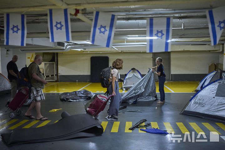 [텔아비브=AP/뉴시스] 24일(현지 시간) 이스라엘 텔아비브에서 이란의 미사일 공습경보에 지하 주차장으로 대피했던 주민들이 경보가 해제되자 밖으로 나오고 있다. 2025.06.24.