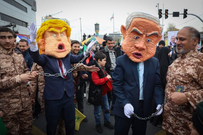 지난 3월 이란 테헤란에서 열린 집회에서 참여자들이 도널드 트럼프 미국 대통령과 베냐민 네타냐후 이스라엘 총리를 연상시키는 모형을 들고 있다.(사진=AFP)