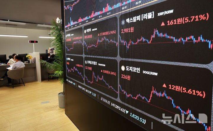 [서울=뉴시스] 배훈식 기자 = 이스라엘과 이란의 휴전 소식이 전해진 24일 오후 서울 강남구 빗썸라운지 강남본점 전광판에 비트코인을 비롯한 주요 코인 가격이 상승세를 보이고 있다.  2025.06.24. dahora83@newsis.com