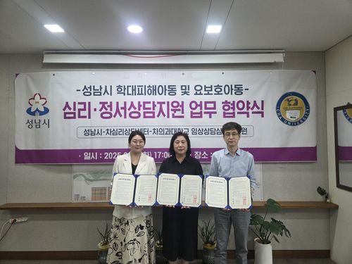 성남시와 차의과대 임상상담심리대학원, 차심리상담센터는 전날 시청에서 '학대피해아동 및 요보호아동 심리·정서 상담 지원 업무 협력 추진에 관한 협약'을 체결했다.