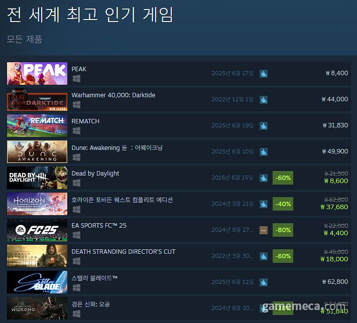 올해 스팀에서는 레포, 스케줄 1 등 인디게임들이 AAA급 게임들을 제치고 글로벌 판매 1위를 찍으며 붐을 일으켰다. 그 뒤를 협동 등산게임 '피크'가 이어가고 있다. 출시와 함께 진행하던 38% 할인이 끝났지만, 입소문을 거세게 타고 여전히 판매 1위를 수성하며 저력을 뽐내고 있다.;