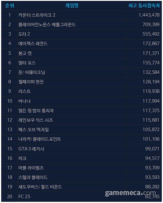 ▲ 6월 25일 오전 10시 기준 스팀 일 최고 동시접속자 TOP 20 (자료출처: 스팀) |