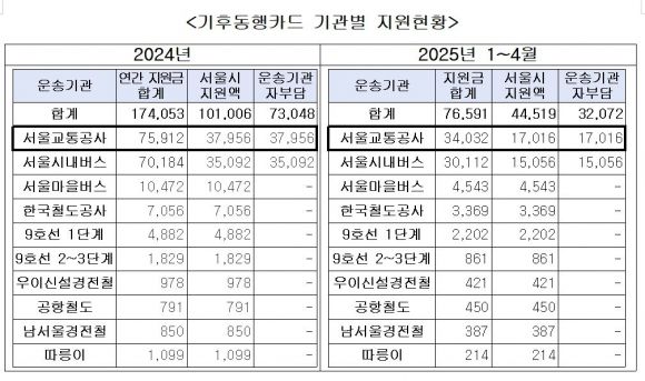 한편, 서울시는 지난해부터 실시한 ‘서울시 기후동행카드’ 사업 운영에 있어 카드 혜택에 따른 지하철 운임 손실금을 서울교통공사가 50% 자부담하도록 지시했다. 이에 따라 공사는 지난해 기후동행카드 지하철 손실분 중 절반인 380억원을 부담했으며, 올해는 4월까지 170억원의 자부담액이 발생했다.