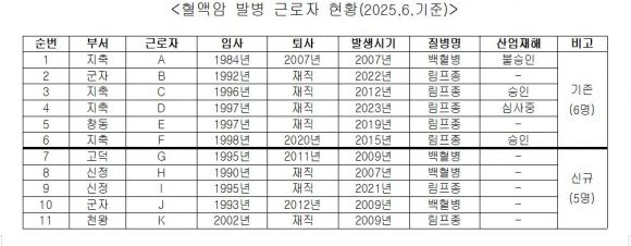 서울교통공사 차량 분야에서 근무하던 근로자 11명에게 혈액암이 발병된 것으로 확인됐다. 지난해 혈액암 근로자 6명 발견 이후 공사에서 자체적으로 실시한 ‘혈액암 발병 현장 조사 연구용역’ 과정에서 5명이 추가로 발견됐으며 이들 중 2명은 사망한 것으로 확인됐다.