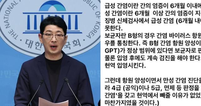 그러면서 "물론 입영 후에도 계속 검진을 해야 한다. B·C형 '보균자'는 3급으로 현역 입영시킨다"며 "그런데 항원 양성이면서 만성 간염 진단을 받았다면 그 심한 정도에 따라 4급 (공익)이나 5급, 면제 등 판정을 내린다. 어느 시기에도 '급성 간염'을 갖고 현역에서 빼줄 이유가 없었다는 것"이라고 설명했다.