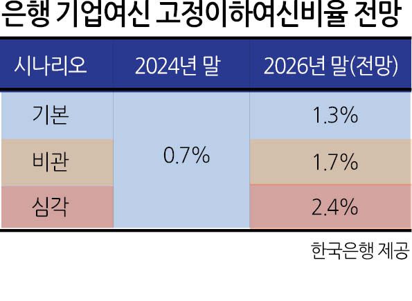 한은이 최근 대내외 불확실성이 현실화하는 충격 시나리오를 가정한 결과 ‘심각’ 시나리오에서 오는 2026년 말까지 고정이하여신비율은 2.4%까지 높아지는 것으로 분석됐다. 심각 시나리오는 내수와 수출이 동반 침체되는 가운데 신용위험이 높아지는 상황을 상정하고 있다.