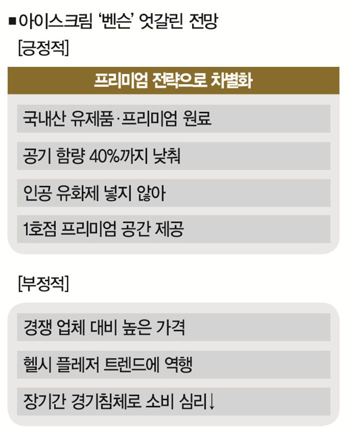 ■긍정론: 차별화 = 관건은 아이스크림계 후발주자 '벤슨'이 시장에 성공적으로 안착할 수 있느냐다. 일단 차별화엔 성공한 듯하다. '프리즈 더 모먼트(Freeze the Momentㆍ영원히 잊지 못할 소중한 순간)'라는 슬로건을 내건 벤슨은 프리미엄 아이스크림이다.