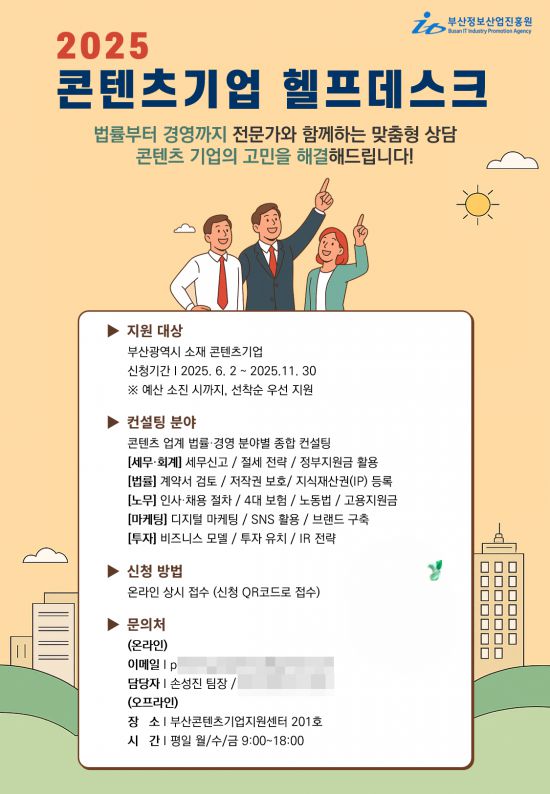 부산정보산업진흥원(원장 김태열)은 지역 콘텐츠 기업의 경영 안정과 지속 가능한 성장을 지원하기 위해 상시 운영 중인 '헬프데스크(Help Desk)'를 통해 맞춤형 컨설팅을 제공하고 있다.