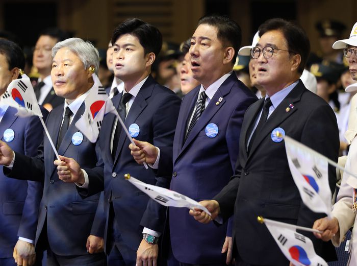 25일 오전 대전 컨벤션센터에서 열린 6·25전쟁 75주년 행사에서 참석자들이 6ㆍ25의 노래를 부르고 있다. 오른쪽부터 우원식 국회의장, 김병기 더불어민주당 원내대표, 김용태 국민의힘 비상대책위원장. [사진출처=연합뉴스] |