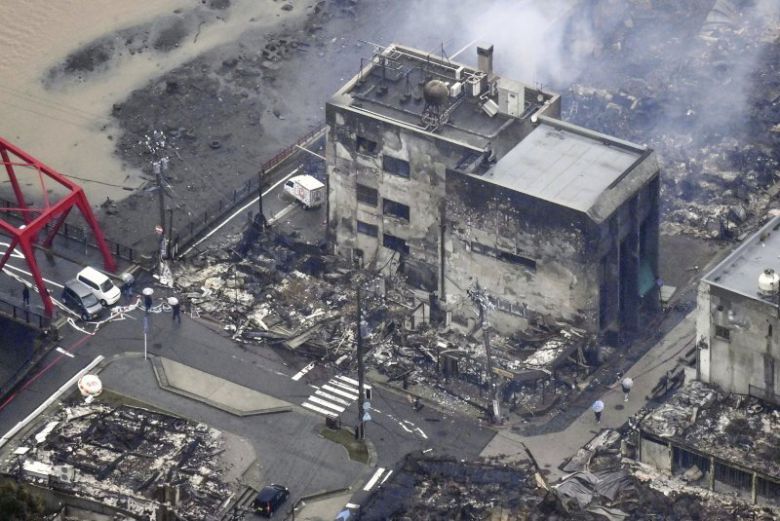 2024년 1월 3일 일본 이시카와현 와지마의 지진으로 타버린 건물에서 연기가 피어오르고 있다. AP연합뉴스
