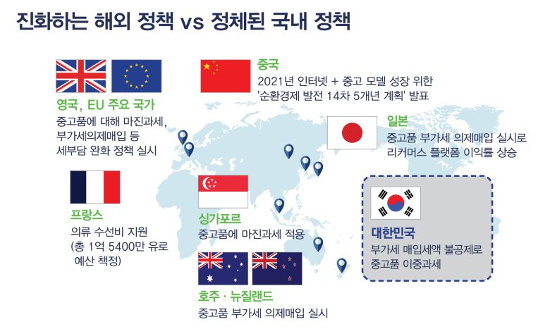 반면 한국은 2010년 법 개정을 통해 중고품 전체에 적용하던 부가세의제매입을 중고차에만 축소, 적용하고 있다. 해외 주요국들이 순환경제 촉진을 위해 중고품에 대한 정책을 확대하고 있는 것과 비교된다.