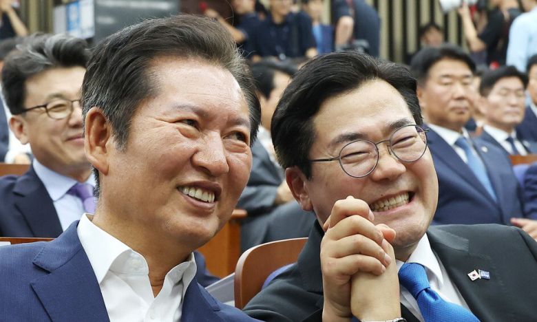 정청래 더불어민주당 의원은 25일 “태평성대 때는 아웃복싱. 내란 세력과의 전쟁 때는 강력한 인파이터. 지금은 강력한 개혁 당대표 정청래가 맞다”고 주장했다. 당대표 자리를 두고 경쟁하고 있는 박찬대 의원이 이날 오전 “야당일 때는 인파이터가 더 필요할지 모르겠지만 여당일 때는 아웃복서(가 더 필요하다)”고 하자, 지금 이 시점에선 ‘내가 더 적임자’라고 다시 강조한 것이다. 8월2일 민주당 전당대회를 앞두고 경선 시작 전부터 ‘당심’을 잡기 위한 치열한 경쟁이 펼쳐지고 있다.