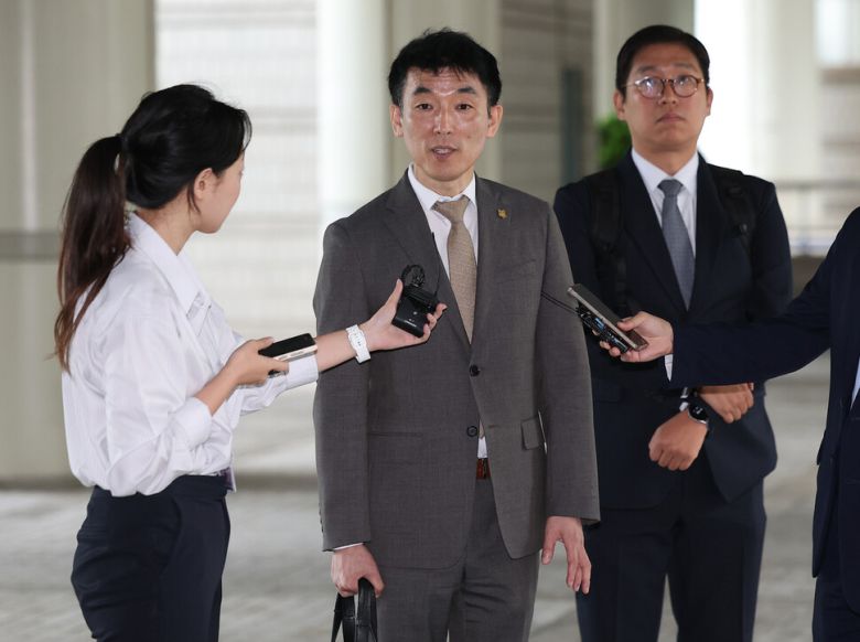 김용현 전 국방부장관에 대한 구속영장 심문이 진행된 25일 서초구 서울중앙지방법원에서 김 전 장관의 변호인인 이하상 변호사가 취재진 질문에 답하고 있다. 연합뉴스