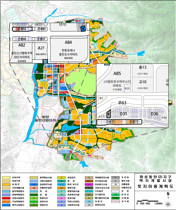 화성동탄2 신도시 내 단독·공동주택, 상업·업무시설, 공공시설 등 다양한 용도를 구분한 토지 이용 계획도가 안내되고 있다. |