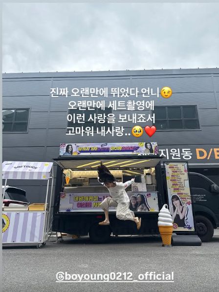 이선빈은 24일 자신의 SNS를 통해 박보영이 선물한 아이스크림 간식차 인증 사진을 여러 장 공개했다.