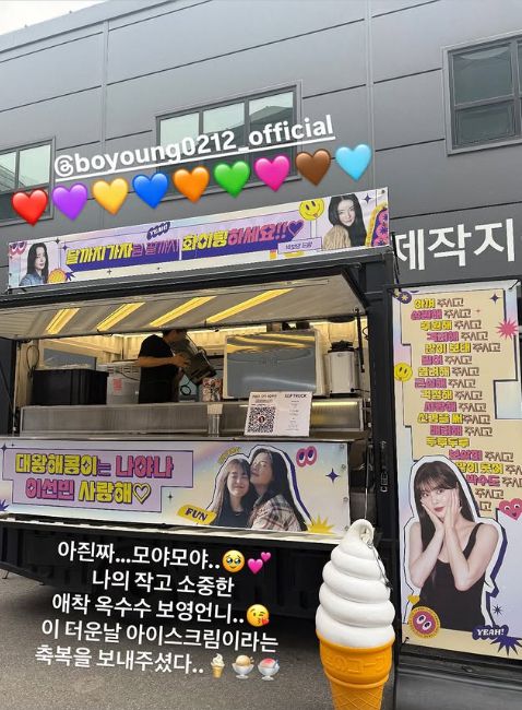 이선빈은 간식차 사진과 함께 “아 진짜 모야모야. 나의 작고 소중한 애착 옥수수 보영 언니. 이 더운 날 아이스크림이라는 축복을 보내주셨다”라는 글을 올리며 박보영을 향한 애칭을 공개했다.