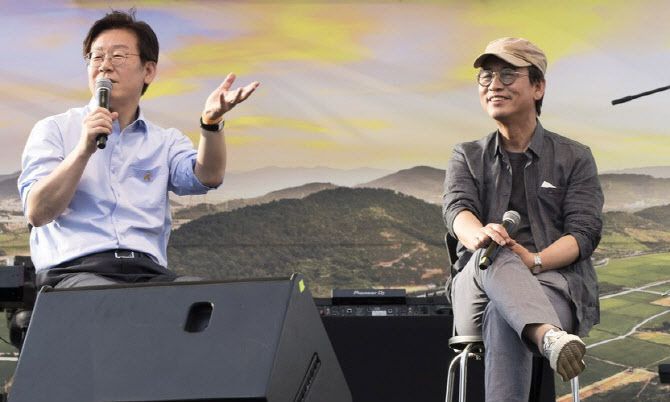 2017년 5월 20일 서울 광화문광장에서 열린 고 노무현 전 대통령 서거 8주기 추모 문화제에서 이재명 당시 성남시장(왼쪽), 유시민 작가가 대화하고 있다 (사진=연합뉴스) |