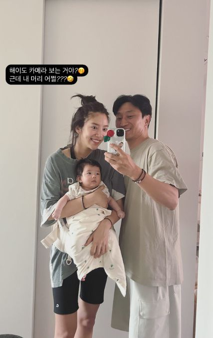 25일 손담비는 자신의 SNS 스토리에 "해이도 카메라 보는 거야?"라는 글과 함께 가족과 찍은 거울 셀카를 공개했다.