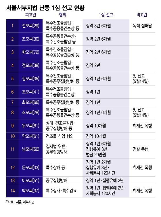 1심 선고 결과 중 현재까지 가장 높은 형량을 받은 인물은 이른바 '녹색 점퍼남' 전모씨(29)로 징역 3년 6개월을 선고받았다. 전씨는 경찰 바리케이드 파편 막대기 등으로 법원 창문을 파손하고 현장에 있던 경찰을 향해 소화기를 분사한 혐의 등을 받는다. 범행 후에는 부산까지 도주했던 것으로 전해졌다.