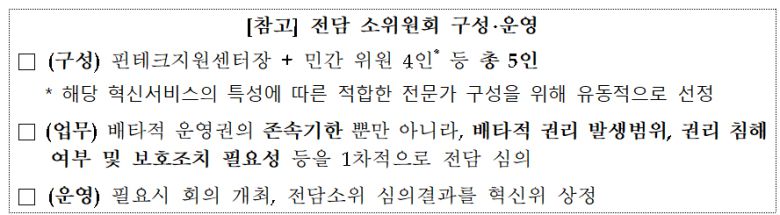 이번 가이드라인에 따라 혁신금융사업자는 정식 사업자 전환 인·허가 신청 시 배타적 운영권 존속기한 부여를 함께 신청할 수 있게 된다. 신청이 접수되면 핀테크지원센터장과 민간 위원 4인으로 구성된 혁신금융심사위원회는 심사를 통해 혁신금융사업자에 배타적 운영기간을 1차적으로 부여한다. 이후 금융위는 심사결과 검토와 의견 청취를 거쳐 기존에 부여된 운영기간에 최대 50%를 가감해 확정한다.