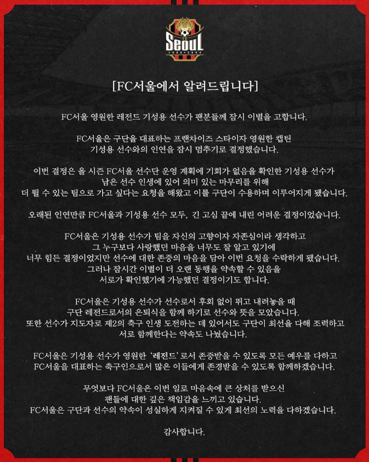 이외에도 서울과 기성용은 차후 지도자로 제2의 축구 인생에 도전하게 된다면 구단이 최선을 다해 조력하기로 약속을 나눈 점도 강조했다.