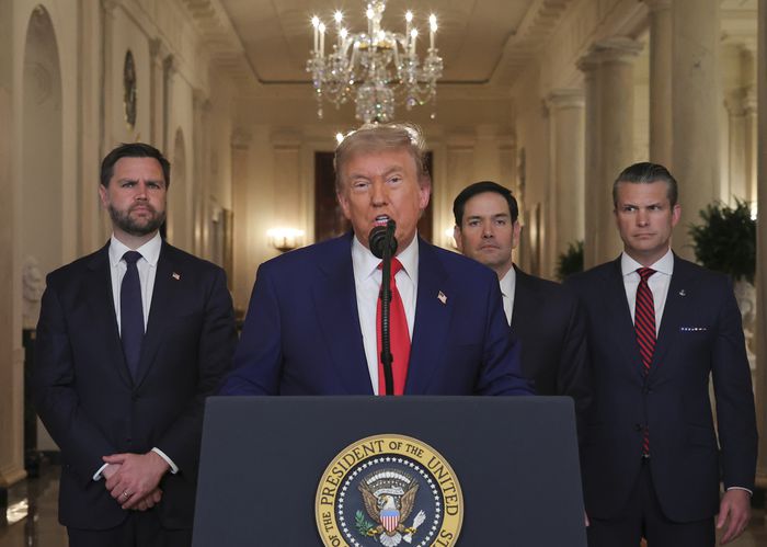 도널드 트럼프 미국 대통령이 21일(현지시간) 백악관 이스트룸에서 이란 핵 시설 타격에 관한 대국민 담화를 하고 있다. AP연합뉴스 |