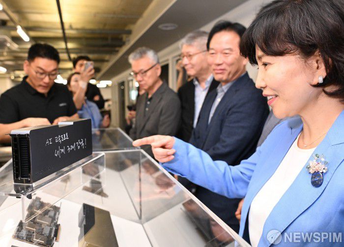 [성남=뉴스핌] 최지환 기자 = 정태호 국정기획위원회 경제1분과 위원장과 분과·전문위원이 25일 오후 경기 성남시 AI반도체 스타트업 리벨리온 본사를 방문해 박성현 리벨리온 대표로부터 리벨리온의 국산 NPU 카드 소개 및 지난 울산 데이터센터 출범식에서 이재명 대통령이 사인한 리벨리온 NPU 카드를 살펴보고 있다. 2025.06.25 choipix16@newspim.com