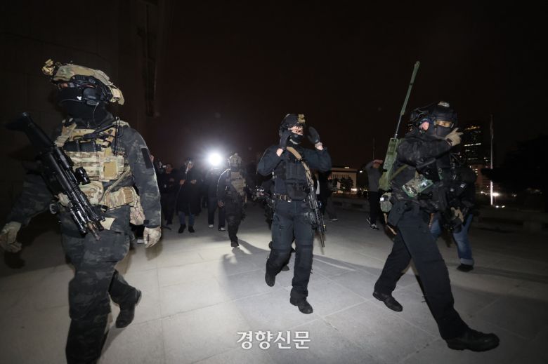 윤석열 당시 대통령이 비상계엄을 선포한 후 자정을 넘긴 2024년 12월4일 새벽 국회의사당에 도착한 무장군인들이 국회 본청으로 이동하고 있다. 성동훈 기자