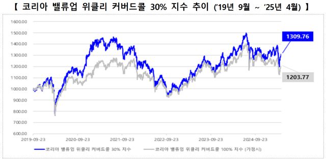 한국거래소 관계자는 "코리아 밸류업 위클리 커버드콜 30% 지수가 ETF 등 금융상품의 기초지수로 활용돼 국내 기업가치 우수기업의 주가상승 수익과 함께 안정적 분배 수익을 추구하고자 하는 투자 수요를 충족할 것으로 기대한다"며 "앞으로도 시장 수요를 반영한 지수를 개발하겠다"고 말했다.