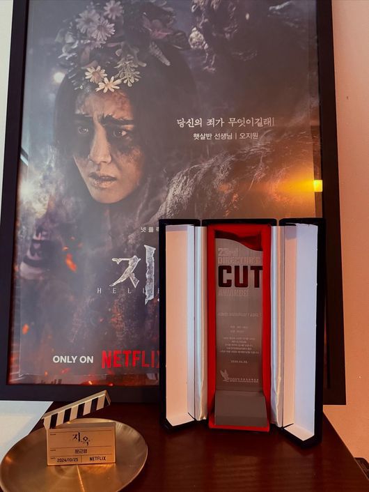 공개된 사진 속 문근영은 넷플릭스 ‘지옥’을 통해 제23회 디렉터스 컷 어워즈 시리즈 부문 새로운 여자 배우상 트로피를 공개했다. 문근영의 수상은 2015년 SBS 연기대상에서 미니시리즈 부문 여자 우수 연기상, 10대 스타상을 받은 후 약 10년 만이다.