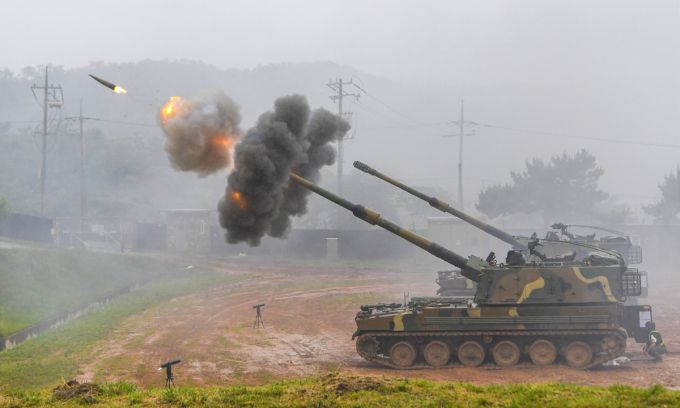 [서울=뉴스핌] 박성준 기자 = 25일 서북도서방위사령부의 해상사격훈련 간 해병대 연평부대 K-9자주포가 사격을 실시하고 있다. [사진=해병대] 2025.06.25 parksj@newspim.com