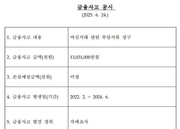 25일 SC제일은행은 여신거래 관련 부당서류 징구로 130억3100만원 규모 금융사고가 발생했다고 전날 공시했다. 대출 사고가 발생한 기간은 2022년 2월부터 지난해 6월까지 약 2년4개월로, 손실 예상금액은 미정이다. 대출 실행 과정에서 차주가 허위 서류를 제출했으나, 이 사실을 파악하지 못하는 등 은행 쪽 과실에 따른 것으로 알려진다.