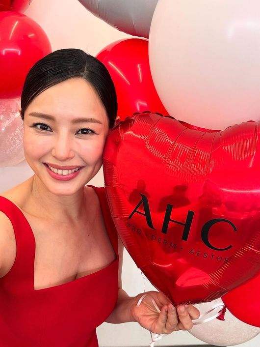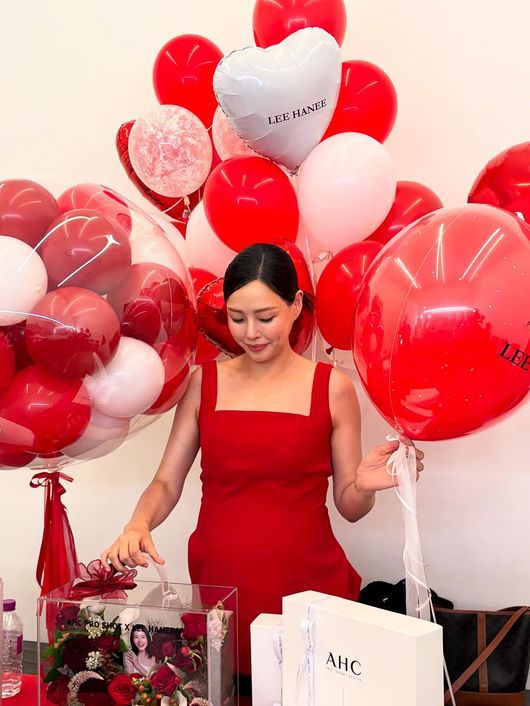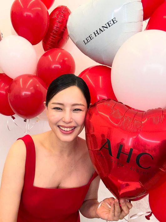 공개된 사진 속 이하늬는 붉은색 드레스를 입고 화장품 브랜드명이 적힌 풍선과 제품들이 가득한 촬영장에서 환하게 미소 짓고 있다.