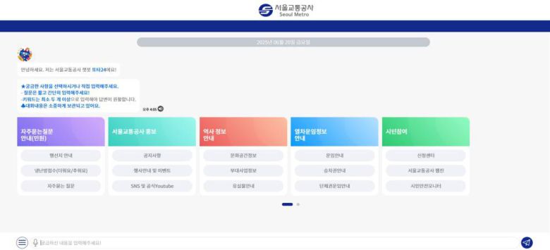 뿐만 아니라 채팅창에는 ▲자주 묻는 질문 안내(행선지 안내, 냉난방 접수, 자주 묻는 질문) ▲서울교통공사 홍보(공지사항, 행사 안내 및 이벤트, SNS 및 공식 유튜브) ▲역사 정보 안내(문화공간 정보, 부대사업 정보, 유실물 안내) ▲열차운임 정보 안내(운임 안내, 승차권 안내, 단체권운임 안내) ▲시민참여(신청 센터, 서울교통공사 웹진, 시민안전모니터) 등의 카테고리도 함께 뜬다. 또 채팅창 아래에는 역사편의시설, 열차이용안내, 간편지연증명서, 홈페이지바로가기, 채용정보, 담당부서연락처 등의 버튼도 따로 있다.