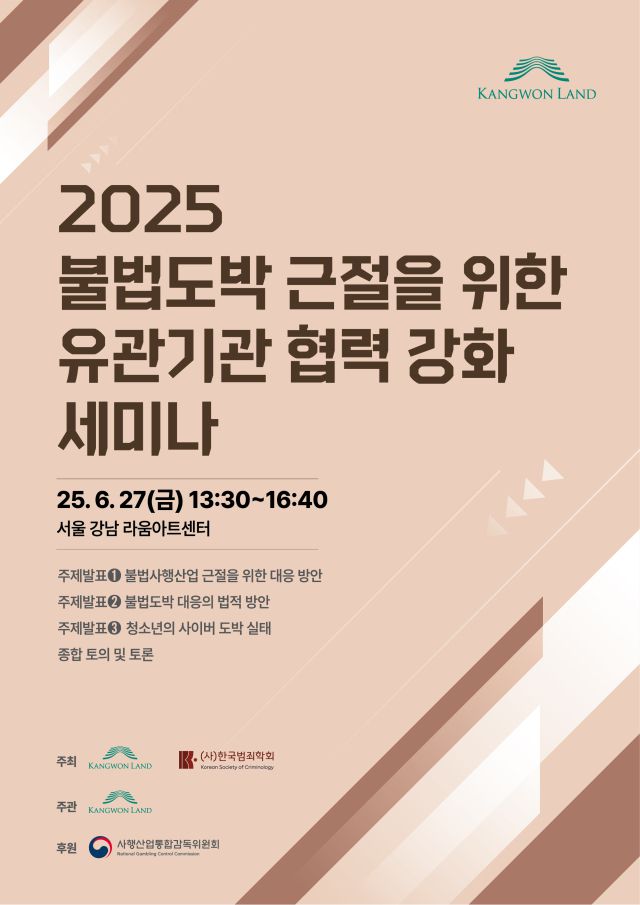 강원랜드(대표이사 직무대행 최철규)가 27일 서울 강남 라움아트센터에서 ‘2025년 불법도박 근절을 위한 유관기관 협력강화 세미나’를 개최한다고 밝혔다.