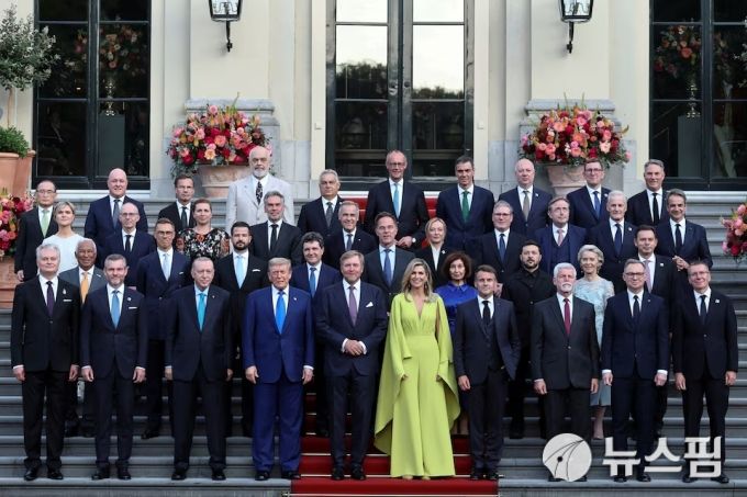 [헤이그 로이터=뉴스핌] 장일현 특파원 = 나토(NATO·북대서양조약기구) 정상회의가 24~25일 32개국 정상들이 참석한 가운데 네덜란드 헤이그에서 열렸다. 사진은 24일 네덜란드의 빌럼 알렉산더 국왕과 막시마 왕비가 각국 정상들과 기념사진을 찍는 모습. 2025.06.25 ihjang67@newspim.com