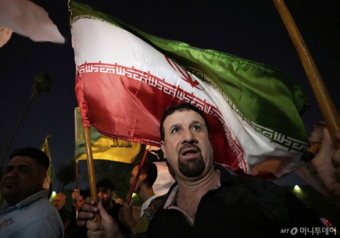 [바그다드=AP/뉴시스] 24일(현지 시간) 이라크 바그다드에서 이란 국기를 든 시위대가 이라크 주재 이란 대사관 앞에 모여 이란과 이스라엘의 휴전을 환영하고 있다. 2025.06.25. /사진=민경찬