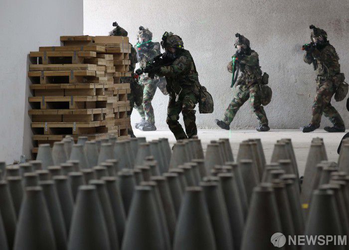 [파주=뉴스핌] 사진공동취재단 = 12일 경기 파주시 무건리 훈련장에서 2025년 FS/TIGER 연습 일환으로 열린 '연합 WMD 제거작전 훈련'에서 제25보병사단 장병들이 WMD 시설에 진입하며 대항군을 사격하고 있다. 2025.03.12 photo@newspim.com |