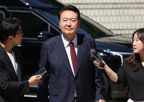 윤석열 전 대통령이 지난 23일 오전 서울 서초구 서울중앙지법에서 내란 우두머리 혐의 사건 8차 공판에 출석하고 있다. 사진공동취재단