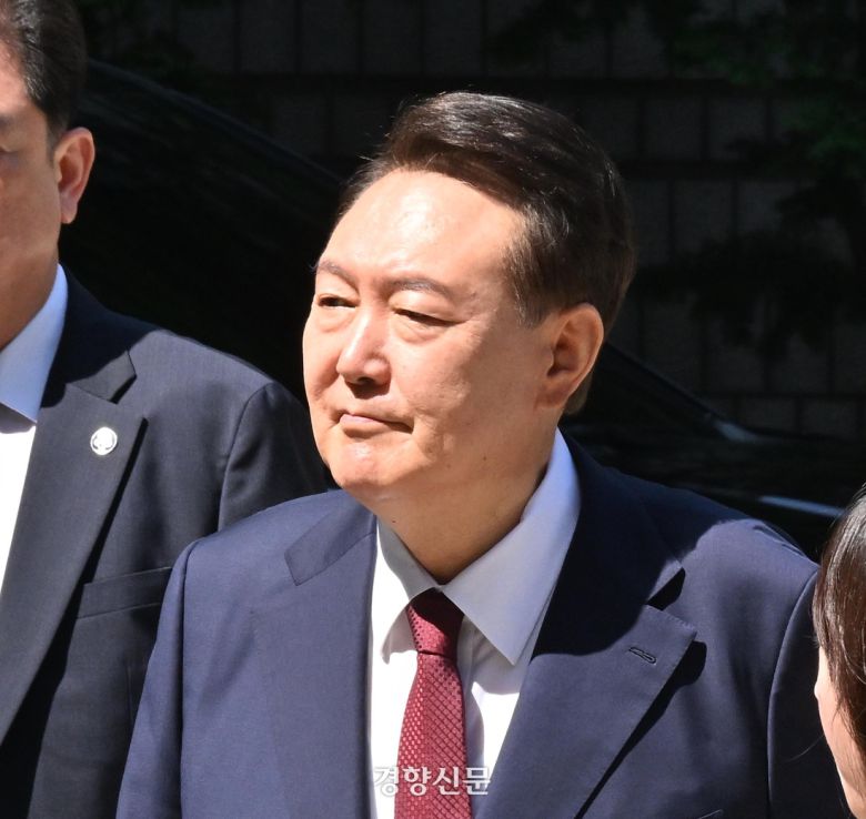윤석열 전 대통령이 23일 서울 서초구 서울중앙지법에서 열린 내란 우두머리 혐의·직권남용 권리행사 방해 혐의 사건 8차 공판에 출석하고 있다. 사진공동취재단