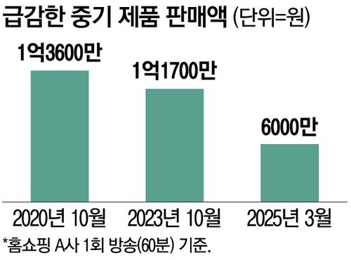 # 젓갈 제조 중소기업 A사는 한때 홈쇼핑 방송마다 1억원 이상 매출을 내며 쏠쏠한 수입을 올렸다. 하지만 매년 홈쇼핑 매출이 급감하더니 지난 3월 방송에서는 6000만원어치를 판매하는 데 그쳤다. A사 관계자는 “매출 효자였던 홈쇼핑 판매가 좀처럼 회복되지 않고 있다”며 “네이버스토어 같은 온라인 판매로 그나마 매출을 유지하는 중”이라고 토로했다.